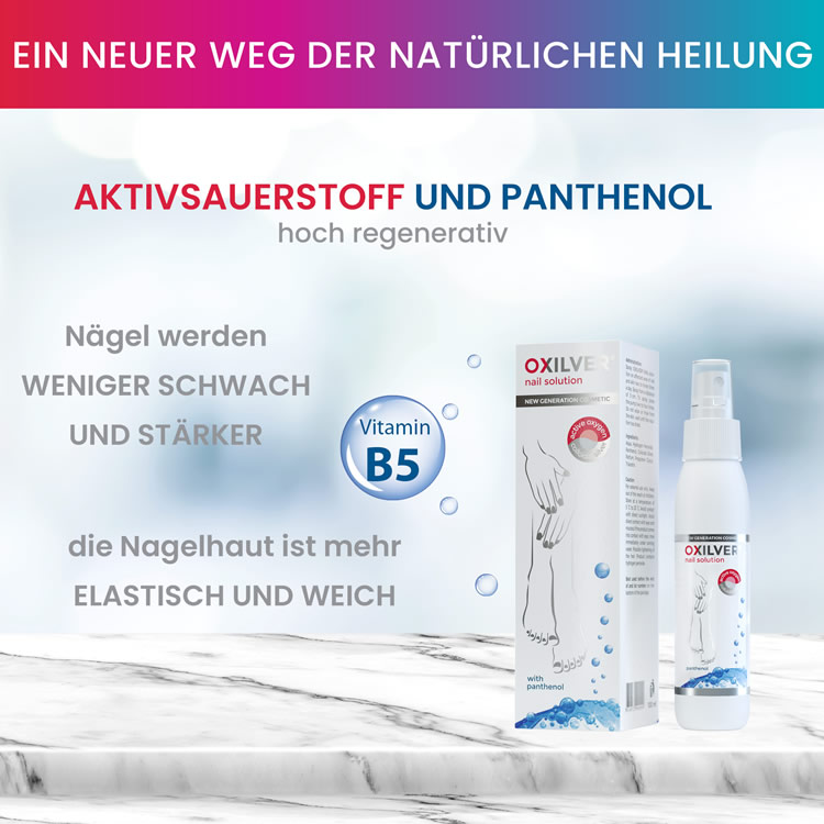 OXILVER® Nail Solution für die Nägel in Sprayform ist ein wirksames und sicheres therapeutisches Kosmetikprodukt auf der Basis von Aktivsauerstoffverbindungen, das zur Pflege und Unterstützung von Nagel- und Nagelhautproblemen entwickelt wurde. Wenn die Lösung mit der Nageloberfläche in Berührung kommt, wird Aktivsauerstoff freigesetzt, der in Kombination mit ionisiertem Silber und dem Zusatz von Panthenol die Nägel mit Sauerstoff versorgt, regeneriert, reinigt und pflegt und gleichzeitig eine leicht antiseptische Wirkung hat.