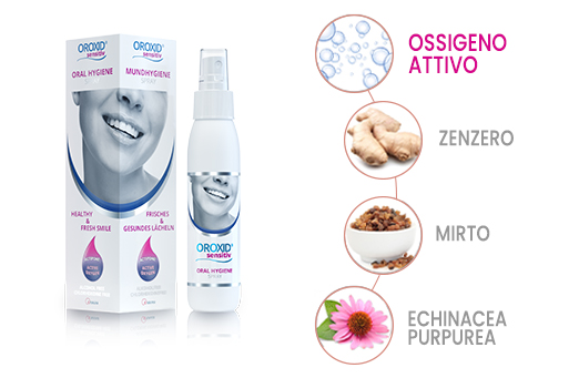 OROXID® sensitiv spray orale è un dispositivo medico innovativo e brevettato a base di ossigeno attivo. Ha lo scopo di mantenere le gengive sane e di alleviare le infiammazioni del cavo orale. L’unicità dei prodotti si riflette nel nuovo principio d’azione, che ossigena, rigenera e disinfetta il cavo orale.