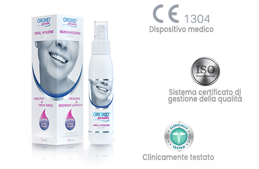 OROXID® sensitiv spray orale è un dispositivo medico innovativo e brevettato a base di ossigeno attivo. Ha lo scopo di mantenere le gengive sane e di alleviare le infiammazioni del cavo orale. L’unicità dei prodotti si riflette nel nuovo principio d’azione, che ossigena, rigenera e disinfetta il cavo orale.