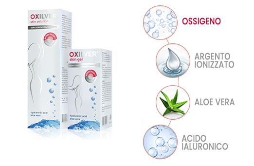 OXILVER® Skin sono cosmetici terapeutici efficaci e sicuri a base di composti di ossigeno attivo, destinati alla cura e come trattamento coadiuvante dei problemi della pelle. Quando il gel viene a contatto con la pelle, viene rilasciato ossigeno attivo che, in combinazione con argento ionizzato, acido ialuronico e Aloe vera, ossigena, rigenera, pulisce, nutre la pelle e ha un’azione leggermente antisettica.