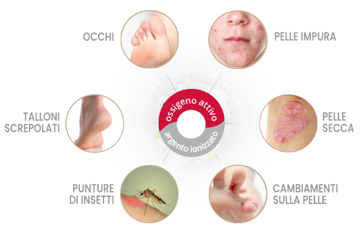 La combinazione di ossigeno attivo e argento ionico funziona in modo complementare, l’efficacia dell’ossigeno attivo aumenta di 3-10 volte grazie all’aggiunta di argento ionizzato. L’argento è presente in una forma ionica che non attraversa nelle cellule e non ha effetti collaterali non provati.